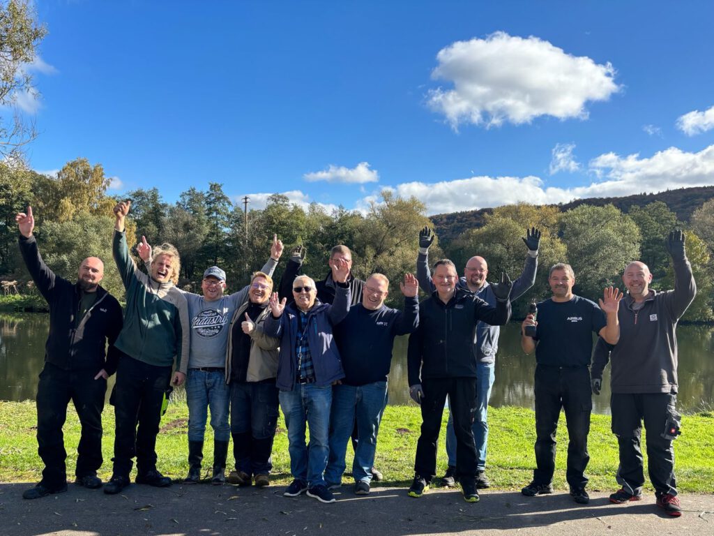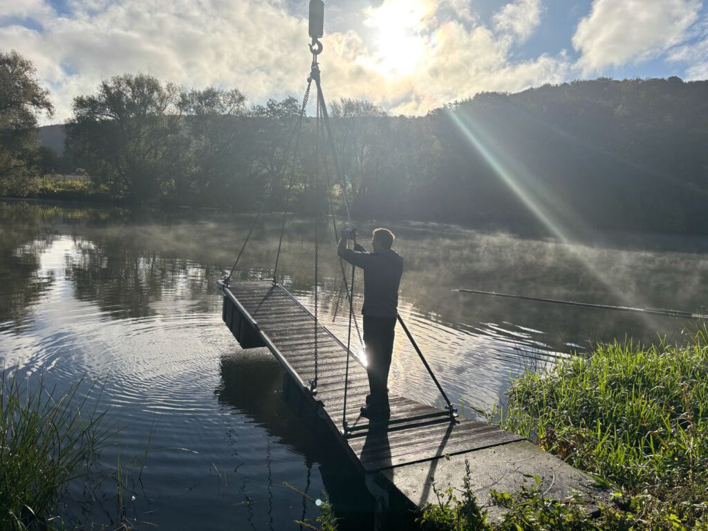 Nach Tagen mit Dauerregen zeigte sich die Fulda am Tag des Stegausbaus von ihrer schönsten Seite: strahlender Sonnenschein, klares Herbstlicht und beste Stimmung. Das angenehme Wetter machte die Arbeit nicht nur leichter, sondern sorgte für eine fast schon fröhliche Aufbruchsstimmung. Wer Stege bei Kälte und Regen ausgebaut hat, weiß: So ein Tag mit Sonne ist Gold wert.