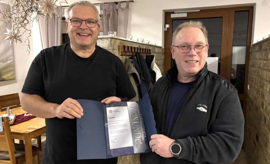Bild 2: Klaus Schomberg (links) nimmt die Ehrenurkunde aus den Händen des Vorsitzenden Mike Mitter entgegen und zeigt sich erfreut über die Würdigung seines langjährigen Engagements für den SBV.